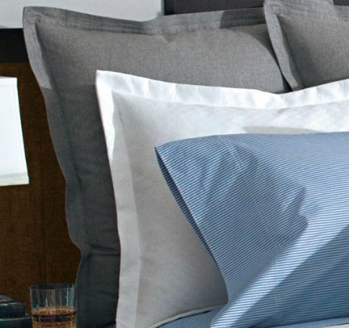 A casual masculine bedding collection, the Lauren Ralph Lauren Jermyn Street bedding ensemble feature sleek vertical stripes in tailored suit colors, and comfortable quilted fabrics on luxurious 200 thread count pure cotton. Taking its inspiration from Jermyn Street, in the heart of London's swanky theater district and Piccadilly Circus, the Jermyn Street bed set combines grey and cool blue for a sophisticated look. Jermyn Street comforter features a sleek grey stripes and flange edging. Coordinating standard shams add a refreshing touch in crisp white with a tailored flange and a center back split closure. While European shams feature a solid grey with flange. Complimenting sheets sets in luxurious 200 thread count pure cotton, feature a cool blue pin stripe and include flat and fitted sheets and pillowcases. Complete your Jermyn Street bed set with matching decorative pillows, a simple square pillow in grey and a blue pillow embroidered with the Lauren Ralph Lauren logo.