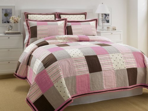 Savannah patchwork quilt brings together a variety of yarn dyed stripes, printed dots and solids. Pique borders and patches throughout the quilt offer a unique texture. Printed chocolate dots on white twill add some fun to the quilt. The yarn dyed stripe patches vary from vintage to bold in a perfect relationship to finish off the quilt. Euro shams are bordered with the retro pink pique with printed chocolate dots on white twill as the center.