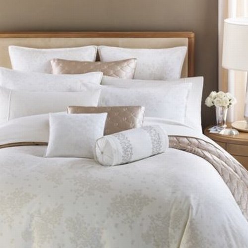 Adrift renews and refreshes like a walk in a dewy meadow. Ferns are tossed across a soft green ground, and delicate embroidered leaves edge the fine sateen 500 thread count winter white sheets, pillowcases, euro shams and bedskirt.