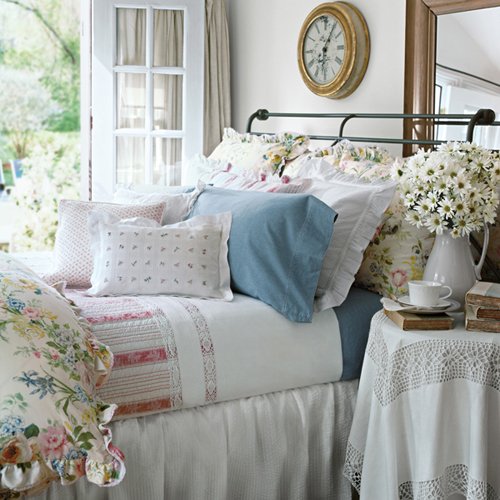 - Floral sham features white eyelet trim.