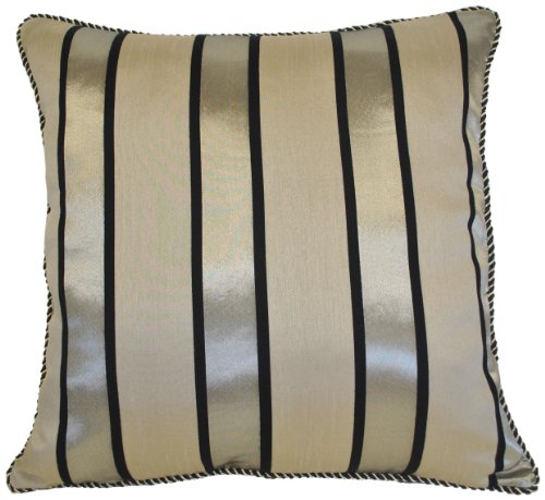 A rich jacquard, in metallic platinum and black color combinations is mixed with matching silk custom trims. The gathered bed skirt is a matching stripe pattern with an 18 inch drop.